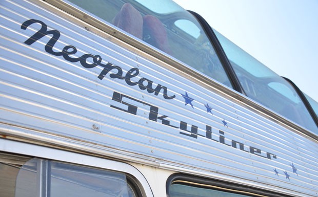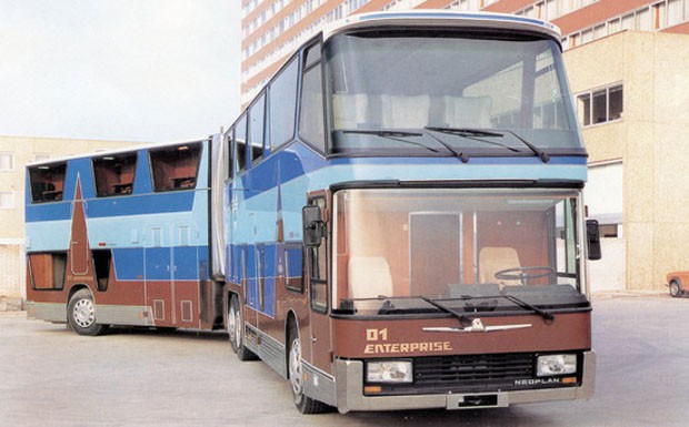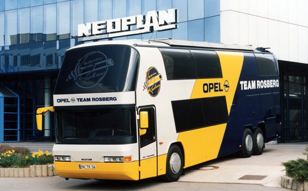 von 14: Für seinen eigenen Rennstall orderte Keke Rosberg 1995 einen Neoplan Skyliner als rollende Kommandozentrale. Mit an Bord waren sechs Fernseher, eine Satellitenanlage, ein Stromaggregat und einen Moderatorentisch mit dem Equipment für Live-Übertragungen - damals purer Luxus