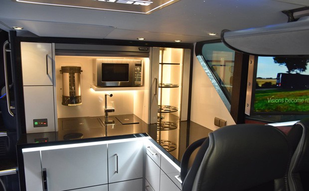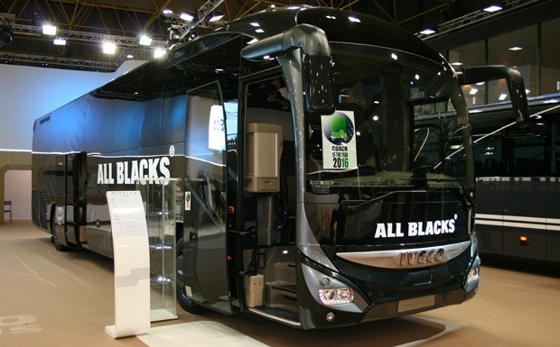 von 38: Jetzt ist es offiziell: Der Iveco Magelys ist der "Coach of the Year 2016". Auf der Busworld fand die Preisübergabe statt. Zu sehen ist ein Fahrzeug für die Neuseeländische Rugby-Mannschaft "All Blacks"