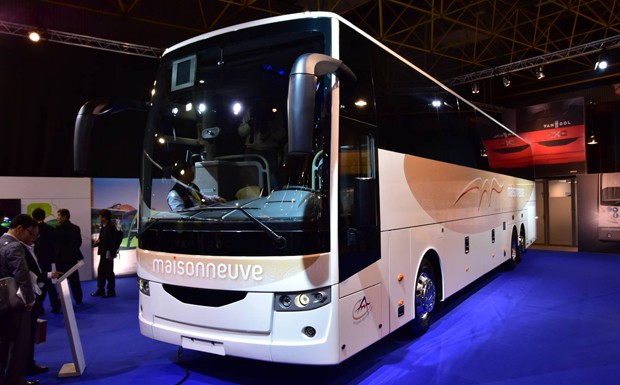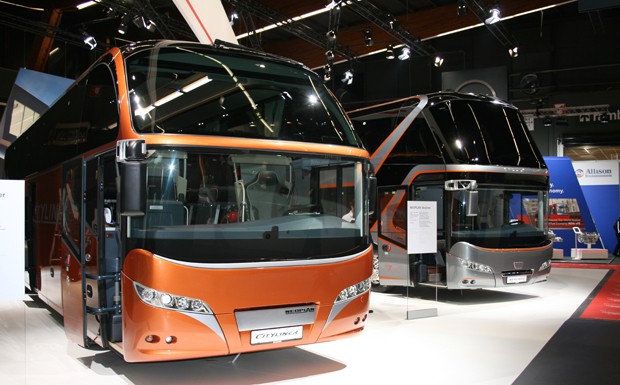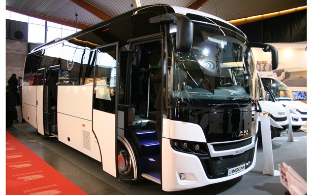von 38: Der spanische Aufbauer Indcar war gleich mit sieben Modellen am Stand vertreten. Der Next L9 (Bild) ist 9,39 Meter lang, bietet Platz für 37 Fahrgäste und basiert auf einem MAN Chassis. Die Front erinnert an einen Lkw