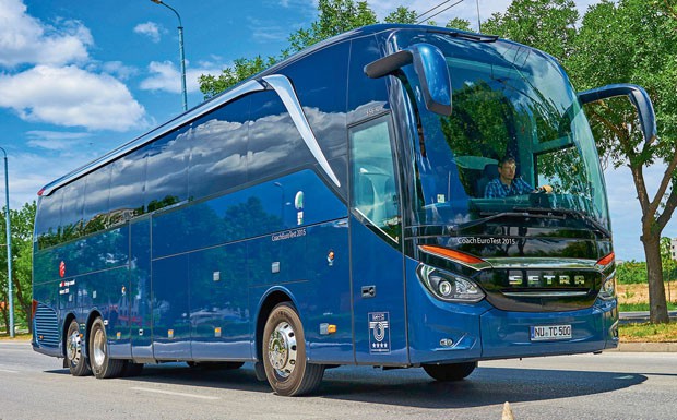 von 15: Setra TopClass 500: Innovationen vom Bug bis zur Abrisskante. Jede Menge Sicherheitstechnik ist an Bord. So besitzt der Bus schon heute eine verstärkte Überrollfestigkeit nach ECE-R 66/01. Der Front Collision Guard wurde weiterentwickelt, der Bremsassistent der letzten Generation, ABA 3, ist an Bord wie auch ein Spurassistent und ein Abstandsregeltempomat