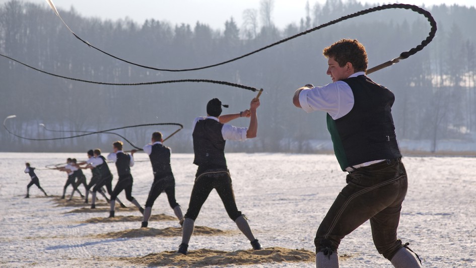 von 31: Laut geht es beim Aperschnalzen im Rupertiwinkel zu. Zwischen dem 26. Dezember und dem Faschingsdienstag treiben die Aperschnalzer mit ihren langen Peitschen, die sie rhythmisch knallen lassen, den Winter lautstark aus