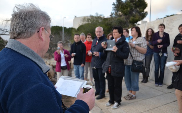 von 80: Auf einem Aussichtspunkt kostet die Gruppe symbolisch Brot und Wein. Ein Reiseteilnehmer liest aus der Bibel, Psalm 122: "... Nun stehen unsere Füße in deinen Toren, Jerusalem ..."