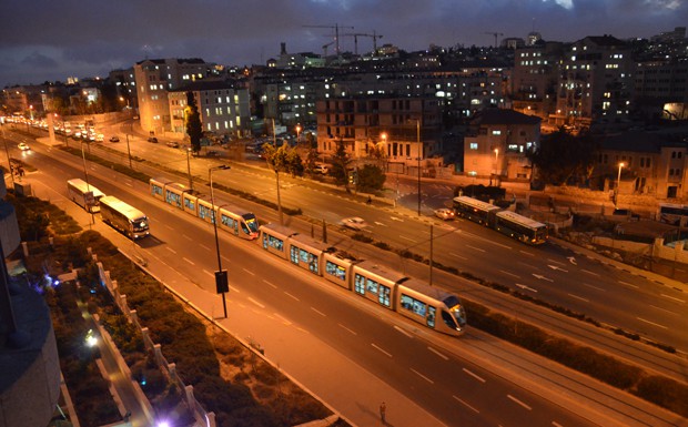von 80: In Jerusalem vermischen sich Tradition und Moderne: Im Vordergrund fährt eine neumodische Straßenbahn, im Hintergrund ist das Viertel der orthdoxen Juden zu sehen