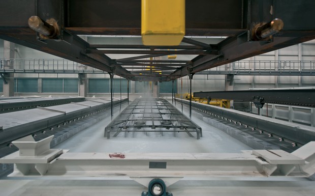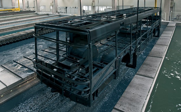 von 13: Die wichtigsten Arbeitsschritte: Das zusammengeschweißte Gerippe (der Rohbau) wird zunächst per Laser auf seine Exaktheit hin vermessen; danach kommt es in die KTL-Anlage. Im nächsten Schritt erfolgt die Außenbeblechung des Gerippe ...