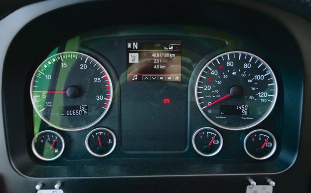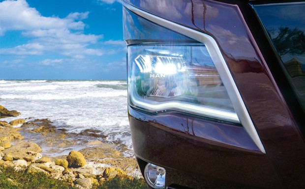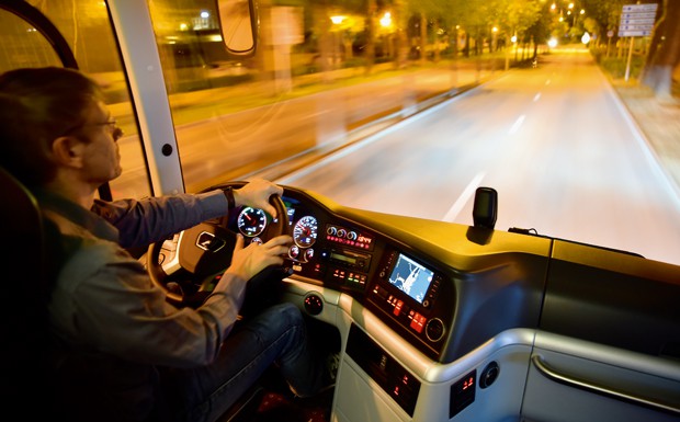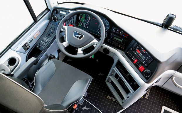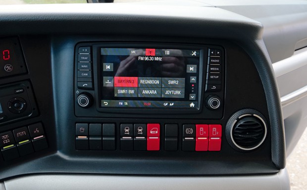 von 16: Der neue MAN Lion's Coach kann gegen Aufpreis mit LED-Hauptscheinwerfern ausgestattet werden. Bei der Probefahrt im Dunkeln überzeugten die Scheinwerfer sowohl durch eine breite, homogene Ausleuchtung der Fahrbahn als auch durch ihre ermüdungsfreie, tageslichtähnliche Farbtemperatur. Die Cockpitbeleuchtung ist nach wie vor ein lustiger Reigen farbiger Lichter. Stört nicht, fördert aber ein wenig die Unruhe am Cockpit