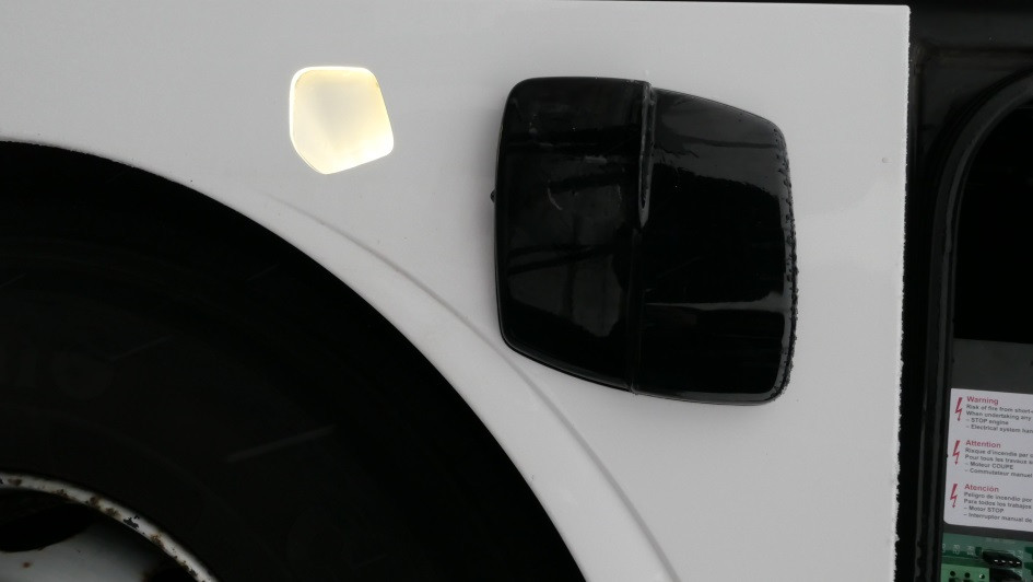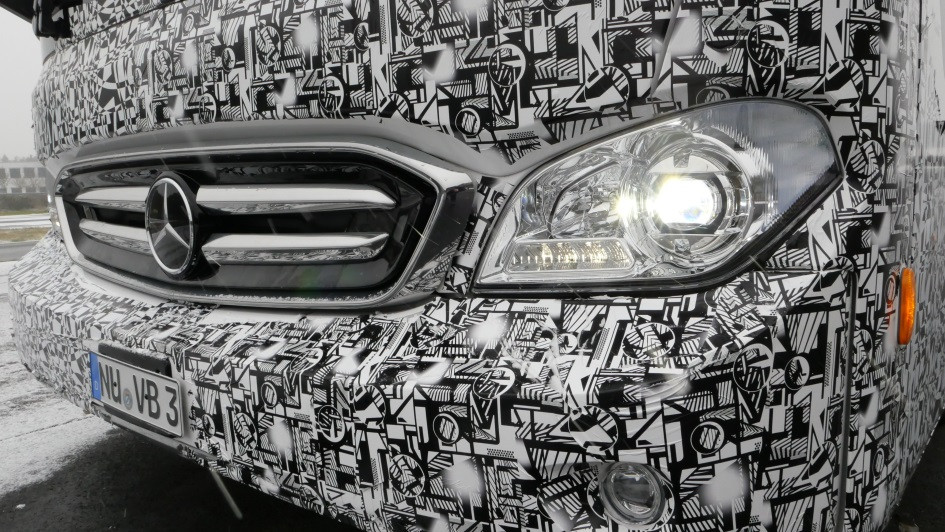 von 10: Der Bus besitzt den Abbiegeassistenten Side Guard Assist, dieser ist bei Mercedes-Benz radarbasiert. Darunter sitzt eines von zwei Docking-Lights, diese beleuchten den Platz vor den Kofferräumen.