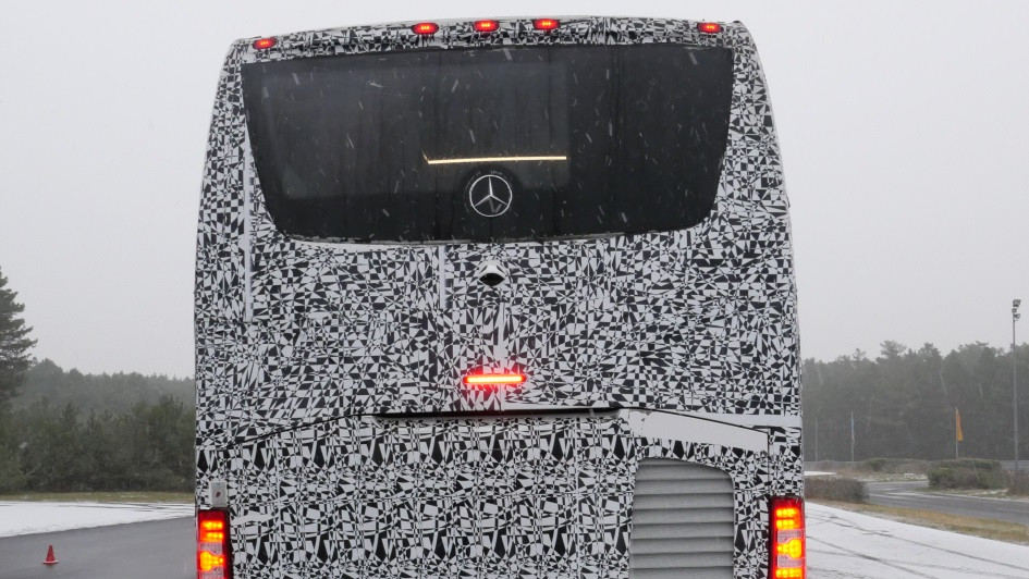 von 10: Anders als bei europäischen Bussen ist die dritte Bremsleuchte, sie ist in Nordamerika vorgeschrieben. Die Rückleuchten steuert ebenfalls der Mercedes-Benz Citaro bei.