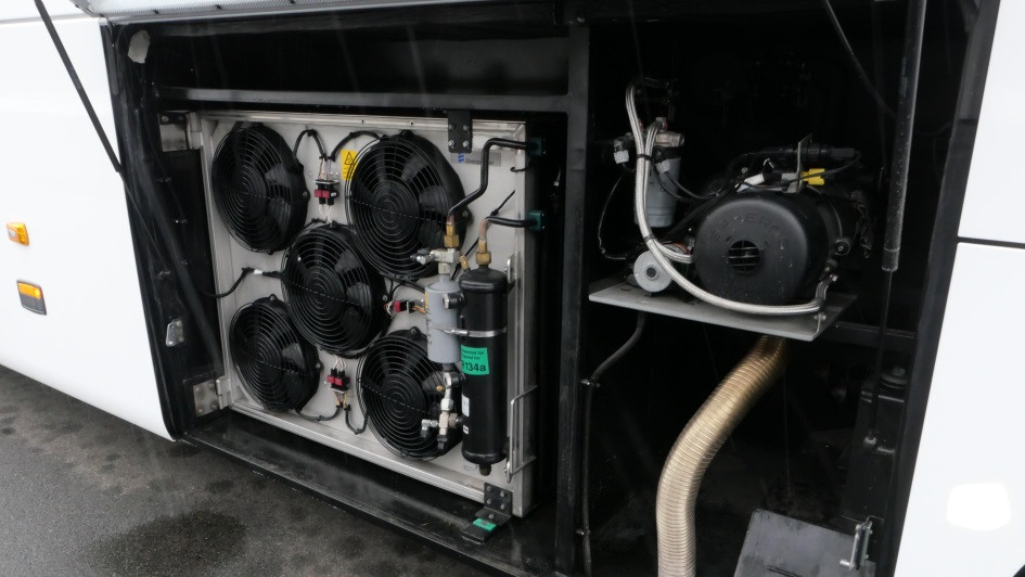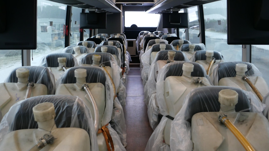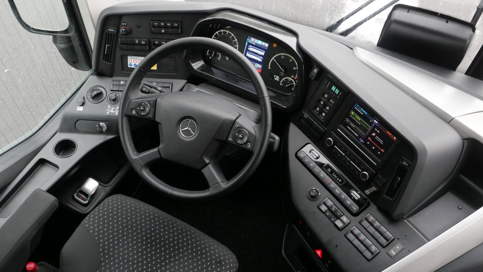 von 10: Die OMNIBUSREVUE konnte einen der Versuchsträger fahren, hier gut zu erkennen an der Ausstattung mit Wasserpuppen. Im Bild fallen zudem die zahlreichen Fahrgastmonitore auf, sie sind typisch bei amerikanischen Reisebussen.