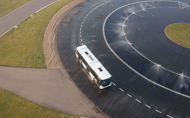 von 31: Die Kreisbahn ließ sich bis problemlos mit Tempo 50 durchfahren, allerdings fing der Bus darüber hinaus deutlich an, über die Vorderachse nach außen zu schieben