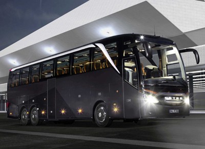 von 3: Unglaublich hochwertig und edel wirkt die neue Front mit ihrem ausgeprägten metallischen Setra-Schriftzug, der auf einer inversen Blende steht