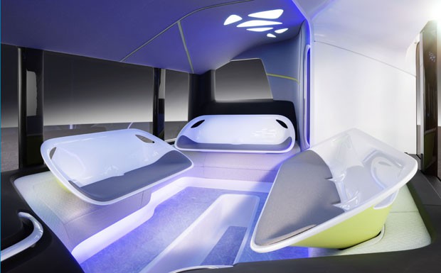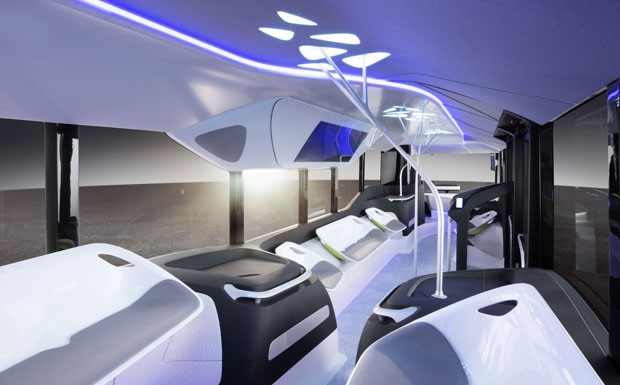 von 16: Der Fahrgastraum ist für die unterschiedliche Verweildauer im Bus in drei Zonen geteilt. An den Wänden reihen sich jeweils Sitze in Form von Designerstühlen in lockerer Anordnung auf