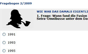 Stolze 90 von 100 Punkten erzielte der Sieger und hat sich damit ein Neoplan Starliner-Modell mit BUSFAHRER-Schriftzug gesichert. Wir gratulieren! Aber das Punkte sammeln geht weiter. Schon in Kürze kommt der erste März-Fragebogen. Und natürlich kann jeder auch jetzt noch den ersten und zweiten Fragebogen beantworten, um Ende 2009 den Jahrespreis abzusahnen. Viel Spaß und Glück, die OMNIBUSREVUE-Redaktion