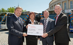 Umweltstaatssekretär Klaus Borger überreichte Saarbahn-Geschäftsführer Norbert Reuter einen symbolischen Scheck über 600.000 Euro. Diesen Betrag erhält das Verkehrsunternehmen als Zuschuss nach dem Gemeindeverkehrsfinanzierungsgesetz (GVFG) für die Anschaffung der Diesel-Solobusse (Mercedes-Benz Citaro). Der Staatssekretär sagte anlässlich der Übergabe: „Der öffentliche Personennahverkehr muss auch in Zeiten knapper finanzieller Mittel seine Wettbewerbsfähigkeit gegenüber dem Auto halten. Die Förderung der neuen Busse ist hierfür eine wichtige und zukunftsgerichtete Maßnahme. Kontinuierlich in moderne Technologien zu investieren heißt nämlich auch, die Umwelt zu schützen und Barrierefreiheit auszubauen.“ Die neuen Fahrzeuge stellen für die Saarbahn GmbH eine Gesamtinvestition von knapp 1,9 Millionen Euro dar. Mit deren Inbetriebnahme werden acht alte Busse mit einem Durchschnittsalter von 15 Jahren ausgemustert. Mit den neuen Citaros nimmt die Saarbahn nun erstmals auch Fahrzeuge in Betrieb, die über Klimaanlagen verfügen. Alle Fahrzeuge sind behindertengerecht mit Absenkvorrichtungen und Klapprampen für Rollstuhlfahrer und Kinderwagen ausgestattet. Die Ausstattung trägt dem Kneeling-Konzept des Unternehmens Rechnung, das seit April 2011 umgesetzt wird. Dadurch soll mobilitätseingeschränkten Fahrgästen, Eltern mit Kinderwagen, sowie Fahrgästen mit Rollator oder schwerem Gepäck der Einstieg erleichtert werden. Darüber hinaus werden die neuen Busse mit einer Videoüberwachung ausgerüstet. (ah)