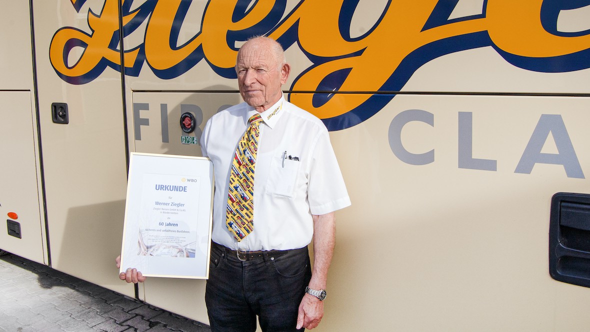 Seit mehr als 60 Jahren besaß Werner Ziegler den Busführerschein und blickt als Unternehmer auf sechs Jahrzehnte im Dienst der Mobilität zurück. Er hatte den Busführerschein bereits vor 1965 als Mitarbeiter der Bundeswehr erworben. Ab 1965 fand er mit dem zivilen Busführerschein über die Schülerbeförderung rund um Niederstetten den Einstieg in das Personenbeförderungsgewerbe. Damit war er gleich zu Beginn seiner Tätigkeit als Busfahrer ein wichtiger Bestandteil der kommunalen Daseinsvorsorge und trug dazu bei, dass – wie heute – die Schülerinnen und Schüler sowie die Bevölkerung der umliegenden Gemeinden an Bildung sowie am wirtschaftlichen und gesellschaftlichen Leben teilhaben konnten. Werner Ziegler zähle damit zu den ÖPNV-Pionieren im Raum Bad Mergentheim, so der WBO.