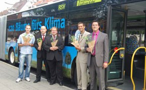 Ab sofort fährt bei dem Verkehrsunternehmen der mit dem Blauen Engel ausgezeichnete Mercedes-Benz Citaro Blue-Tec 5. Ein neues Element im RSV-eigenen Klimaschutzprogramm ist die Zusammenarbeit mit Global Woods. Die vom gebürtigen Reutlinger, Dr. Manfred Vohrer, gegründete Global Woods AG forstet in Argentinien, Paraguay und Uganda Waldgebiete auf und trägt so zur dauerhaften Bindung von CO2 bei. Um die annähernd 60 Tonnen CO2-Ausstoss eines Gelenkbusses im Jahr zu binden, ist es für den klimaneutralen Betrieb notwendig, 120 Bäume anzupflanzen. Global Woods garantiert der RSV mit TÜV-Zertifikat, dass der Klimahandel nicht nur symbolisch mit der Außengestaltung des neuen Busses nachvollzogen wird, sondern in den Anbaugebieten dauerhaft zum weltweiten Klimaschutz beiträgt. Foto v.l.n.r.: Emir Sarac (Azubi zum Berufskraftfahrer), Michael Exner (Fahrdienstleiter), Dirk Dannenfeld (Verband Baden-Württembergischer Omnibusunternehmer), Bernd Kugel (Leiter Marketing), Mark Hogenmüller (Techn. Geschäftsführer)