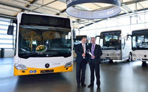 Ralf Steinmetz, Geschäftsführer des Darmstädter Verkehrsunternehmens HEAG mobiBus, hat den Stadtbus von Ulrich Piotrowski, Verkaufsleiter Mercedes-Benz Omnibusse Region West, im Omnibus Neuwagen Center ONC in Mannheim entgegen genommen. Bereits 2012 hat Daimler Buses die ersten Serien-Stadtbusse in Euro 6-Ausführung auf die Straße gebracht. Der Verbrauchsvorteil des Euro 6-Stadtbusses gegenüber seinem Euro 5-Vorgänger lag bei einem Effizienztest im Herbst 2012 unter neutraler Aufsicht des Dekra bei 8,5 Prozent.