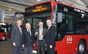 Die Kieler Verkehrsgesellschaft (KVG) ist ihrem Ziel, den modernsten Niederflurbusfuhrpark in Schleswig-Holstein zu haben, ein Stück weiter gekommen. „Mit der heutigen offiziellen Inbetriebnahme von elf nagelneuen Fahrzeugen des Typs Citaro vom Hersteller EvoBus bieten wir unseren Fahrgästen nicht nur die neueste Technik, sondern auch höchsten Fahrkomfort“, verspricht KVG-Geschäftsführer Andreas Schulz. Drei Millionen Euro wurden für die Auffrischung des Fuhrparks in die Hand genommen. Den elf Niederflurgelenkbusse verstärken folgen im April drei Solobusse. Die neuen Fahrzeuge erfüllen die Abgasnorm Euro 5 und werden mit Biodiesel betrieben. Im Innenraum können die Fahrgäste den Linienverlauf ihrer Busfahrt mit Flachbildschirmen verfolgen. Dunkelblaue, mit Graffitielementen versetzte Sitze und viel Platz für Kinderwagen und Rollstuhlfahrer sind ebenso vorhanden.