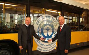Die ersten fünf von 144 umweltfreundlichen Linienbussen von Mercedes Benz erlebten am 12. Oktober in der "Mercedes Welt" am Salzufer in Berlin ihr Roll-out. Winfried Heckt, Leiter Verkauf Omnibusse Mercedes Benz Deutschland, übergab die Fahrzeuge an Andreas Sturmowski, Vorstandsvorsitzender der Berliner Verkehrsbetriebe BVG.