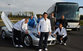 Auf der Teststrecke in Grevenbroich absolvierte der Bus seinen ersten Test gegen einen SLR McLaren Stirling Moss. Ein Vergleich mit Augenzwinkern zwischen dem größten und komfortabelsten „Taxi“ und dem derzeit schnellsten und exklusivsten Modell von Mercedes-Benz. Den Mitfahrern Oliver Bierhoff, Robert Enke, Sami Khedira und Piotr Trochowski war der Spaß an dem außergewöhnlichen Wettrennen anzusehen. „Wir wollen, dass die Spieler komfortabel und sicher von Spiel zu Spiel reisen, um sich entspannt auf die nächste Begegnung konzentrieren zu können“, sagt Hartmut Schick, Leiter Daimler Busse. „Der neue Mercedes-Benz Travego passt daher perfekt zur deutschen Nationalmannschaft. Er ist die Fortsetzung einer erfolgreichen Reisebus-Generation der Spitzenklasse. Zudem ist sein Sicherheitskonzept in dieser Klasse wegweisend.“ Neben dem elektronischen Stabilitäts-Programm (ESP), Anti-Blockier-System (ABS) und Antriebs-Schlupf-Regelung (ASR), verfügt er zusätzlich über Dauer-Brems-Limiter (DBL), Abstandsregel-Tempomat (ART), Brems- und Spurassistent (BA und SPA), Active Break Assist (ABA), Front Collision Guard (FCG) sowie einer Rückfahrkamera. Außerdem wartet der neue Bus mit Licht- und Regensensor, Litronic Scheinwerfer mit Abbiegelicht und Follow-me-home-Licht auf. Im Innenraum ist der Bus mit 36 gepolsterten Ledersitzen, vier Tischen, Flachbildschirmen und Kühlschränken ausgestattet.