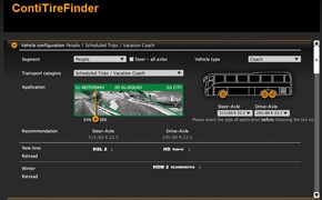 Unter www.continental-lkw-reifen.de/reifenfinder erhalten Interessenten in Abhängigkeit ihrer individuellen Bedürfnisse konkrete Kaufempfehlungen für Reifen oder Runderneuerungen. Der ContiTireFinder empfiehlt den richtigen Reifen, nachdem der Anwender die notwendigen Angaben zur Nutzung gemacht hat. Entscheidend sind hierbei das Kundensegment, die Transportkategorie, die Art des Einsatzes und der Fahrzeugtyp. Analog zum Reifenprogramm von Continental unterscheidet die Software die Kundensegmente Güter- und Personentransport sowie den Baustelleneinsatz. Bei der Einsatzart kann der Anwender zwischen Autobahn, Landstraße, Stadtverkehr oder Off-Road wählen und hierbei den prozentualen Anteil über einen anschaulichen Schieber stufenlos variieren. Einfluss auf die richtige Reifenwahl haben schließlich auch noch die gewünschte Reifendimension sowie der Fahrzeugtyp, wobei hier eine der drei Varianten (Reise-, Regional- und Stadtbus) ausgewählt werden kann. Die Eingabe der erforderlichen Daten ist innerhalb weniger Sekunden abgeschlossen und das Ergebnis steht unmittelbar bereit. Der Nutzer sieht sofort, wie sich die Änderungen einzelner Voraussetzungen – wie zum Beispiel das Einsatzprofil – auf die Reifenempfehlung auswirkt. (ah)