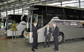 Diese Reisebusse der ComfortClass 400 überzeugen erstmalig mit einem Glasdach im vorderen und hinteren Teil des Omnibusses sowie mit einer hochwertigen Innenausstattung, unter anderem mit Videoanlage. Anlässlich der feierlichen Fahrzeugübergabe im Setra Kundencenter in Neu-Ulm an den Präsidenten der Groupe Lacroix, Jean-Sébastien Barrault, unterstrich Lothar Holder, Markensprecher Setra Omnibusse der EvoBus GmbH, die Bedeutung des Referenzkunden Groupe Lacroix für die Setra Aktivitäten in Frankreich. „Wir sind stolz auf die Markentreue der Groupe Lacroix und sind überzeugt, dass wir mit unserer Produktqualität und dem im französischen Markt traditionell guten Namen Setra zum Erfolg der noch jungen Groupe Lacroix beitragen können. Als nicht unerheblichen Grund dafür sehen wir die Basis dieser erfreulichen Entwicklung auch in der wirtschaftlich gesunden Stammfirma Cars Lacroix, die schon seit über 40 Jahren gute Geschäftsbeziehungen zu unserer Marke pflegt.“ Ein wesentlicher Garant dafür, dass die guten Verbindungen auch zukünftig bestünden, sei die französische Setra Vertriebsorganisation in Sarcelles bei Paris, die vor Ort die enge Kundenbindung pflege. Die gute Chemie zwischen Hersteller und Abnehmer spiegle sich zudem in der Aussage Jean-Sébastien Barraults wider: „In der Groupe Lacroix sind heute über 50 Prozent der Fahrzeuge Setra Omnibusse und es werden immer mehr.“