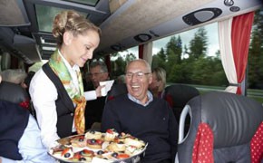 Im klassifizierten Bus ist Reisen ein Genuss: Diese Botschaft vermittelt eine CD mit rund 60 Fotos, die Besucher des RDA-Workshops am Stand B11 der Gütegemeinschaft Buskomfort kostenlos erhalten. Darauf zu sehen: Eine attraktive Hostess, die gut gelaunte Busreise-Senioren mit Schampus verwöhnt.