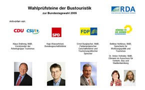 Bereits im November letzten Jahres hat sich der RDA mit einer ausführlichen „Wahlprüfliste“ an alle im Bundestag vertretenen Parteien gewandt. Die politischen Forderungen der Branche wurden als präzise Fragen formuliert und so konkret nachgehakt, wie die Parteien dazu stehen. Die eingegangenen Antworten von CDU/CSU, SPD, FDP und Bündnis 90/Die Grünen hat der RDA in einer „Wahlprüfliste“ gegenübergestellt, damit Busunternehmer, deren touristische Partner, Mitarbeiter und Gäste Anhaltspunkte für die eigene Wahlentscheidung haben. „Wir wollten gemeinsam mit der gbk wissen, wer an der Seite der Unternehmer steht“, erläutert RDA-Präsident Richard Eberhardt. „Und diese Erkenntnisse stellen wir nach der Auswertung den Busunternehmern, ihren Mitarbeitern aber auch den Gästen zur Verfügung.“ „So kann sich jeder ein Bild davon machen, welche Partei seine Interessen am wahrscheinlichsten vertritt und wir werden die Regierungsparteien nach der Wahl beim Wort nehmen. Denn, es geht uns um nachhaltige Branchen- aber auch um Tourismuspolitik – zum Wohle der Unternehmer, der Mitarbeiter und der Gäste“, betont Eberhardt. Die Antworten stehen als pdf zur Verfügung unter: http://www.rda.de/html/modules/Downloads/Wahlpruefsteine_2009.pdf